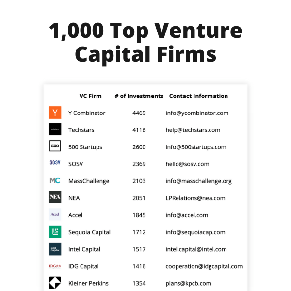 1,000 VC firms, each with their URL, founded year, name of founders, number of investments, number of exits, funds raised, contact email/phone, average check size, and countries, cities, industries, and stages they invest in.