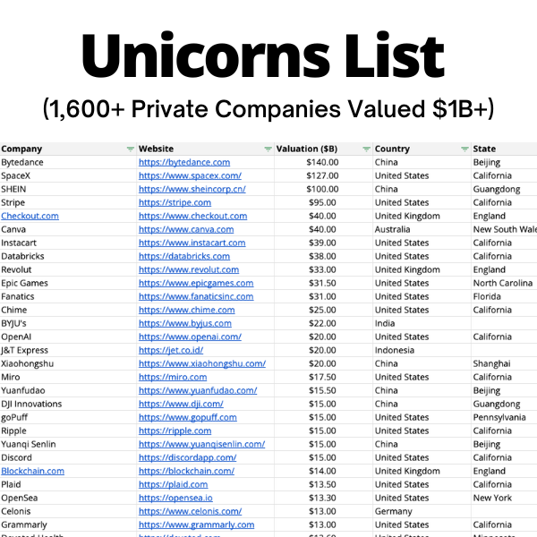 1,600+ unicorn companies with information about their country, state, city, industries, founded year, name of founders, total funding, number of employees, and valuation.